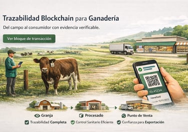 Desarrollamos sistemas integrados de trazabilidad basados en blockchain que registran cada etapa del ciclo de vida del animal, desde su nacimiento hasta la llegada al consumidor final.